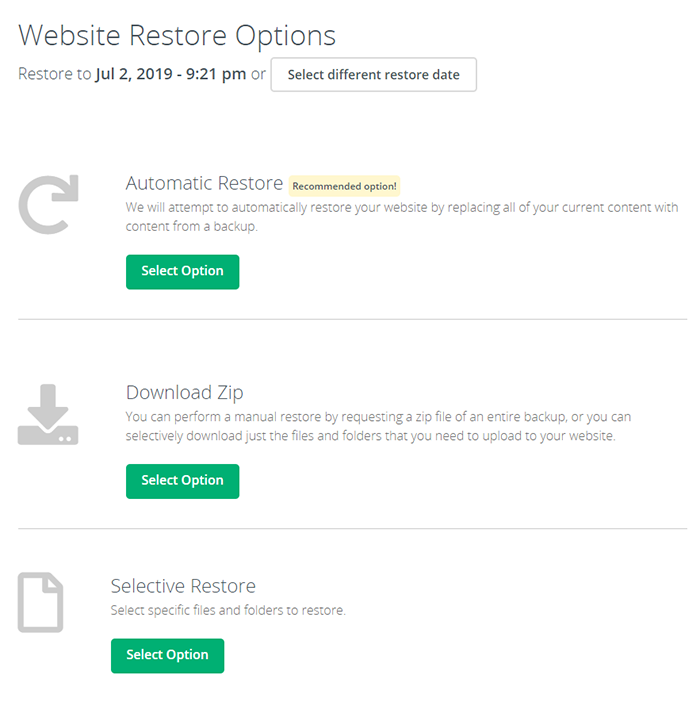 After everything has been backed up, restoring your website is as simple as a few mouse clicks. Simply select the backup you'd like and hit the “Restore” button. Within seconds your website will have reverted back its previous iteration. Users have the option to: